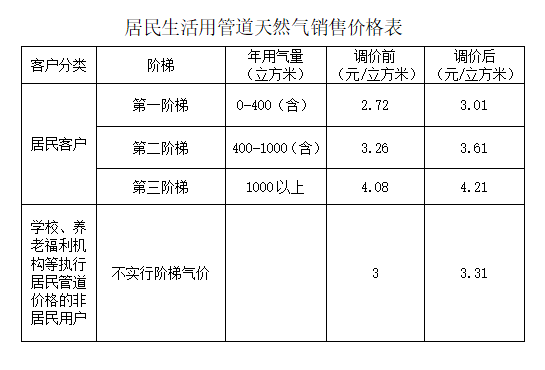 居民用戶第一、二、三階梯銷售價格分別調(diào)整為3.01元/立方米、3.61元/立方米、4.21元/立方米;執(zhí)行居民用管道天然氣銷售價格的非居民用戶(各類學(xué)校教學(xué)生活用氣,民政福利機構(gòu),養(yǎng)老機構(gòu)生活用氣等),管道天然氣銷售價格調(diào)整為3.31元/立方米。