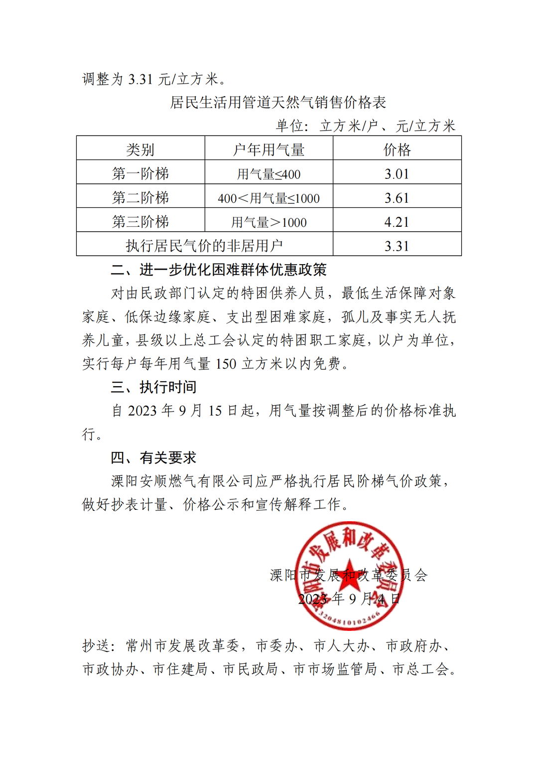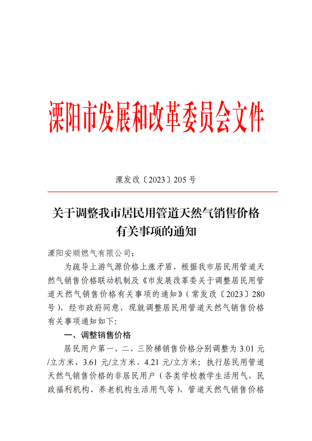 您好!根據(jù)溧陽發(fā)改委《關(guān)于調(diào)整居民用管道天然氣銷售價格有關(guān)事項的通知》(溧發(fā)改【2023】205號)文件的要求,現(xiàn)就調(diào)整通知如下: