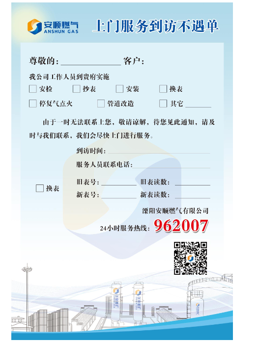 當您在家門口看到了《上門服務(wù)到訪不遇單》,請及時與通知單上預(yù)留的電話聯(lián)系,也可以聯(lián)系溧陽安順燃氣24小時服務(wù)搶修熱線962007,與工作人員約定好上門時間配合入戶安檢,完成燃氣安全檢查工作。