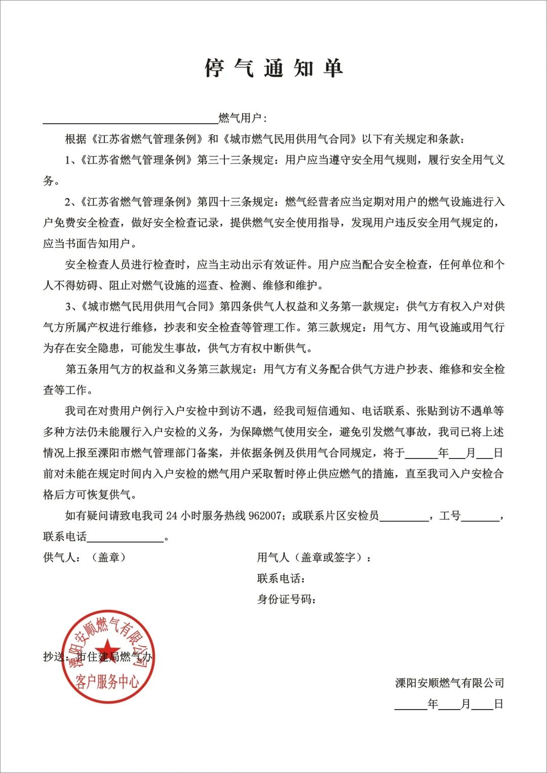 燃氣經(jīng)營企業(yè)入戶安檢因用戶原因連續(xù)2次到訪不遇且無法聯(lián)系或安檢之日起一個月內(nèi)無法有效入戶的,燃氣經(jīng)營企業(yè)應(yīng)在告知用戶(短信、信件或上門張貼告知書等方式)及物業(yè)(村、社區(qū))后采取必要的關(guān)閥、暫停供氣等措施,在實施有效入戶安檢后及時恢復(fù)供氣。
