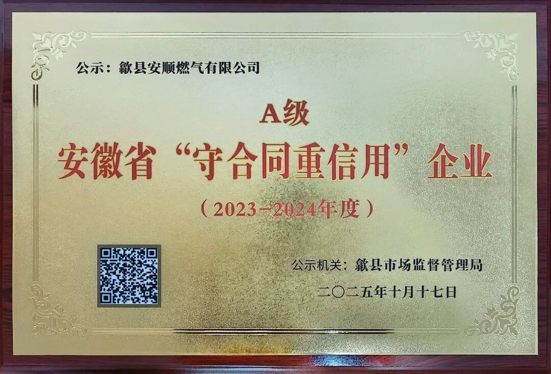 近日,安徽省2025年度“守合同重信用”企業(yè)評(píng)選結(jié)果揭曉,歙縣安順燃?xì)庥邢薰緫{借其在長(zhǎng)期經(jīng)營(yíng)中始終如一的誠(chéng)信實(shí)踐與卓越的合同管理能力,成功獲評(píng)A級(jí)榮譽(yù)稱號(hào)。